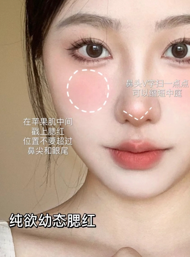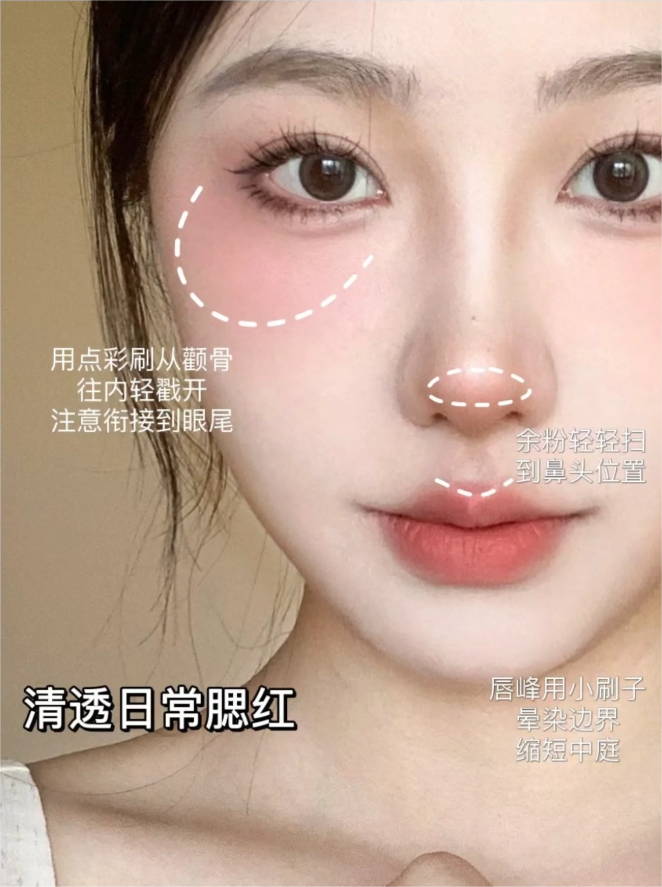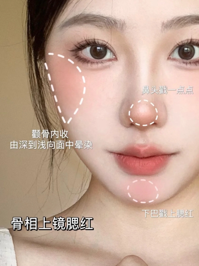 1、日常腮红:沿著颧骨阴影向面中过渡,视觉上小脸腮红颜色可以选择和妆容色调一致的颜色